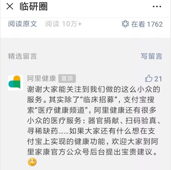 近期,公众号临研圈的文章《神奇!支付宝里居然可以搜到临床试验》引发热议。十万加流量下,也引来阿里健康官方留言感谢。
