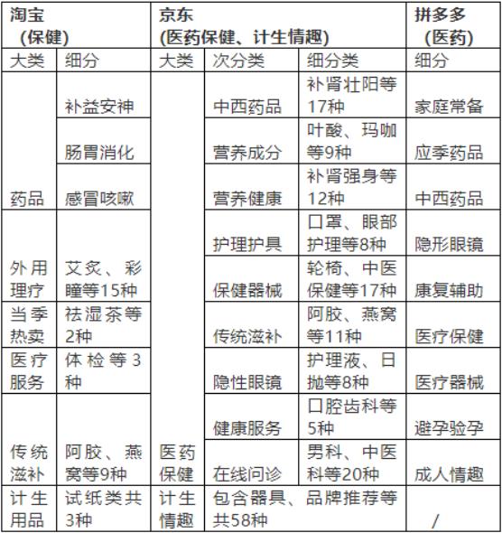 拼多多的医药分类较为简单,与淘宝、京东的同类产品划分见下表。