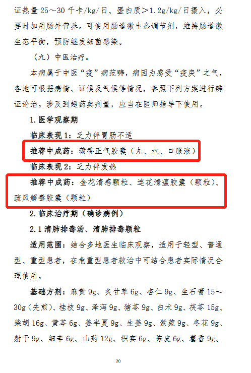 藿香正气胶囊(丸、水、口服液)、金花清感颗粒、连花清瘟胶囊(颗粒)、疏风解毒胶囊(颗粒)、喜炎平注射液、血必净注射液、参附注射液、生脉注射液被推荐5次(第四版-第八版均被推荐);